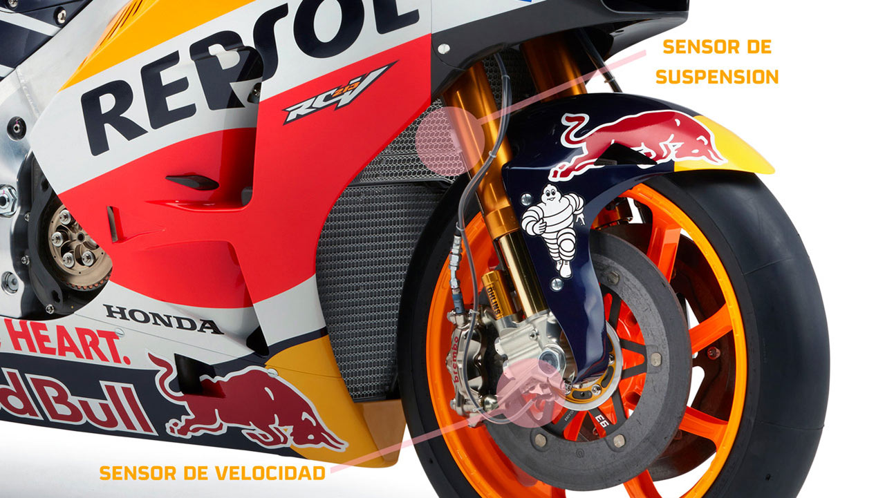 The RC213V has a few dozen sensors responsible for checking everything from the suspension position to the pressure in the pneumatic valve system, as well as the inclination or acceleration of the bike. All of these electronics communicate with an advanced switchboard able to make various calculations per second to optimise the bike’s performance based on the needs of the situation and the rider’s wishes, as they control the different options available from the handlebars.