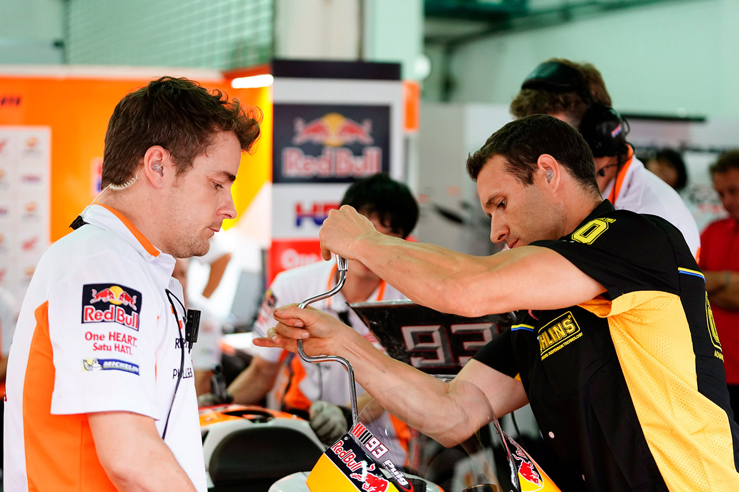 There are many aspects that affect the selection of suspension used by GP teams: track conditions, tyres used, pilot feedback, and engineering calculations. Though the suspension may seem a simple component at first it is in fact particularly complex. The front fork alone is made up of over 300 parts. In MotoGP the suspension is supplied by Öhlins, a company whose production is based entirely on these components.