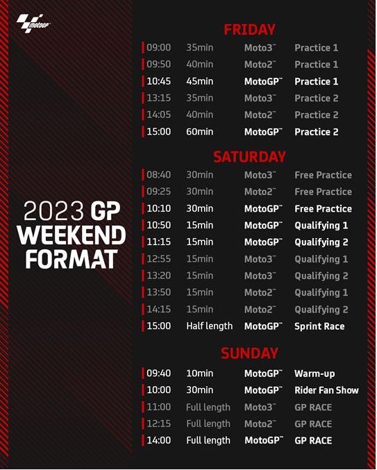 Starting in 2023, the Grand Prix race format will include a new attraction: sprint races, or short distance tests, to be held on the Saturday afternoons of each Grand Prix. MotoGP will be the only category of the championship to hold this additional contest. It aims create more hype in the competition by adding an enticement to Saturday’s events.