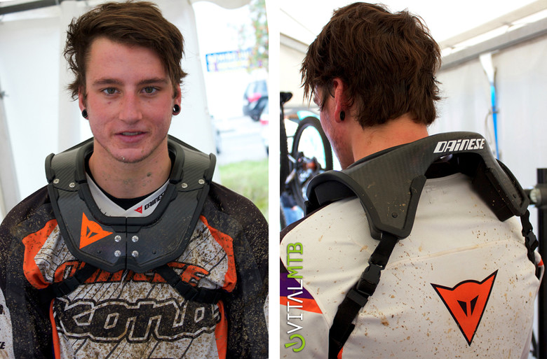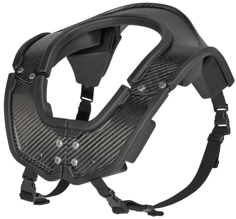 The neck brace is placed around the neck and supports it in such a way that it limits excessive helmet movements in all directions, preventing a sudden jarring of the head from causing injuries or fractures to the cervical vertebrae. In addition to fulfilling this function, the neck brace also has to be light weight to reduce the overall weight of the rider, so the most sophisticated ones are made of materials such as carbon fiber or Kevlar.
