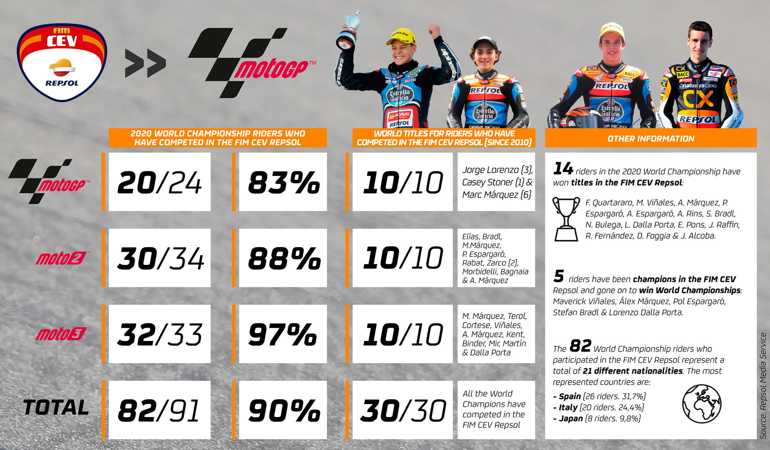 The FIM CEV Repsol 2020 season comes to a close this weekend with 7 races at the Circuit de la Comunitat Valenciana Ricardo Tormo. All eyes will be on the competition that has become the perfect springboard to MotoGP in recent years, with some 82 of the 91 riders who have contested races in the 2020 World Championship also previously participated in the FIM CEV Repsol. Of these, 14 were champions in the FIM CEV Repsol, with 5 going on to become World Champions: Maverick Viñales, Álex Márquez, Pol Espargaró, Stefan Bradl and Lorenzo Dalla Porta.