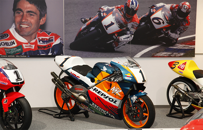 Cualquier motero que visite esta maravilla de edificio se quedará de piedra delante de la primera Honda NSR jamás diseñada. Es del año 1984 y fue usada por el legendario Freddie Spencer en el Mundial de Motociclismo.