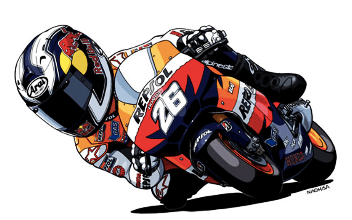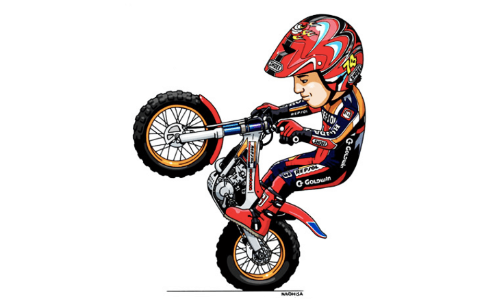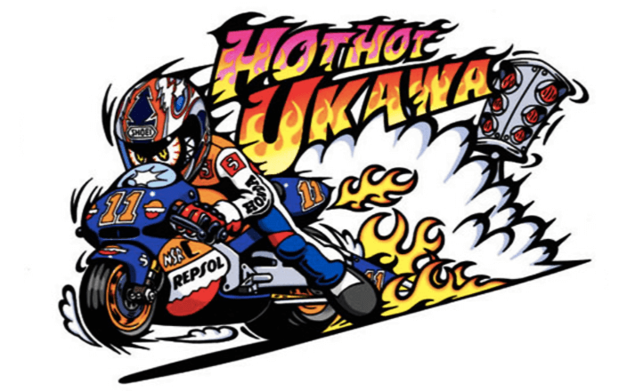 Otro componente del Equipo Repsol Honda que ha pasado por la pluma de este artista nacido en Yokohama es el piloto japonés Tohru Ukawa. En el 2001 compitió en la categoría reina teniendo como compañero de filas a Àlex Crivillé, que dos años antes había conseguido ser el primer español en ganar el Mundial de 500cc. Tohru logró un podio en la segunda carrera, en el GP de Suráfrica, y terminó el campeonato en décima posición. En su segundo año con nosotros mejoró mucho su rendimiento, terminó la temporada en tercera posición, ¡nada mal! Eran los años en los que en la parrilla había hasta nueve pilotos nacidos en el imperio del sol naciente.