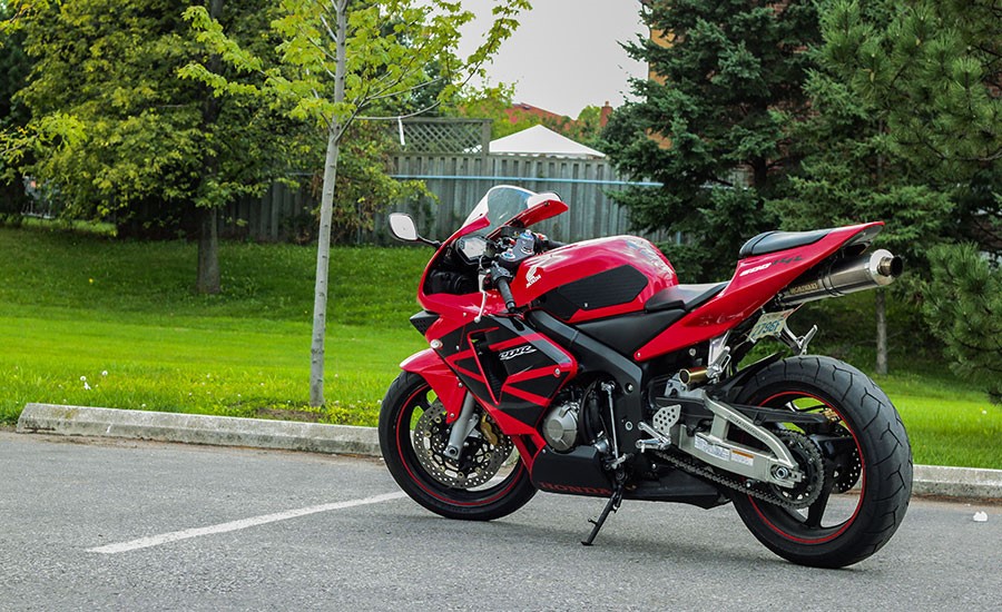 Una Honda CBR 1000RR Fireblade roja y negra aparcada en la calle frente a un parque