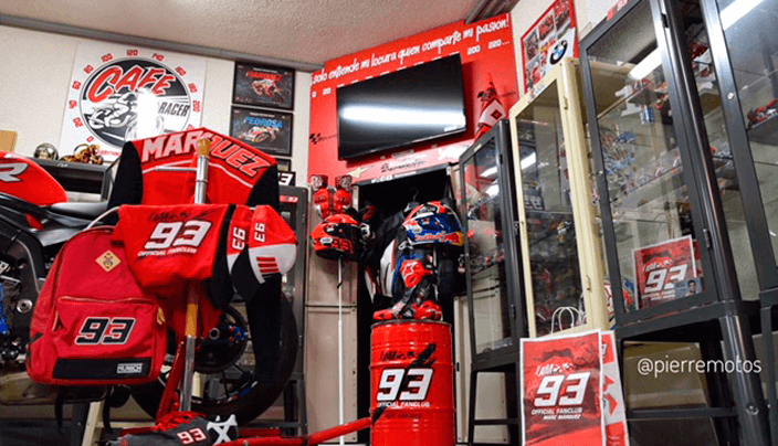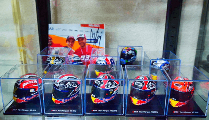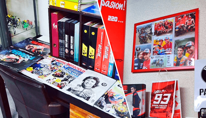 R- En el 2015 empecé a montar todo. Hablé con mi mujer y le dije que iba montar en el garaje “mi espacio motero”. Cuando se lo comenté ni siquiera me dijo nada porque ya sabía que era seguidor de Marc Márquez, y que me apasionaban las motos. Poco a poco iba colgando fotos de la evolución del garaje en los distintos grupos moteros que hay en internet, y gracias a los comentarios positivos de los compañeros me he ido motivando cada vez más y a la vez coleccionando más cosas ¡hasta el punto de tener el garaje con 93 por todos los lados y una gran colección de miniaturas pósteres, revistas, cascos, etc.