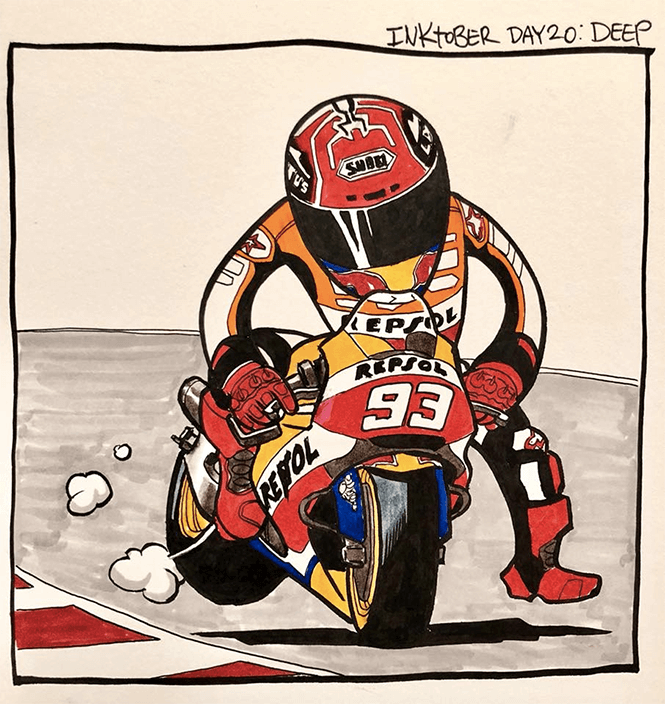 En su página de Facebook se presenta como apasionado por las motos, el baseball, el wing chun (un arte marcial chino tradicional), la ilustración, respirar y el agua. En ese orden. Si en algo coinciden todas esas aficiones es en el movimiento constante, y ese es precisamente uno de los elementos que más y mejor capta en sus trabajos, que, por cierto, pueden adquirirse a través de internet. Son dibujos dinámicos, y puesto que las motos son sinónimo de velocidad y aventura, capta como pocos la esencia de las dos ruedas.