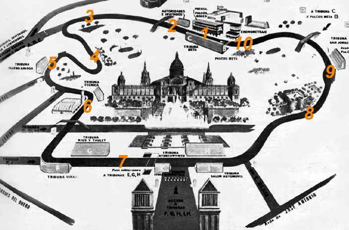 La pista aprovechaba las calles y avenidas de la montaña del Parc de Montjuic. Al circular a través de virajes de trazado natural, su forma era muy pintoresca.
