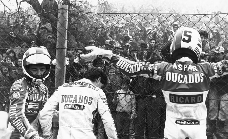 GP Jarama 1986, Aspar, Nieto y Champi Herreros saludando a los aficionados.