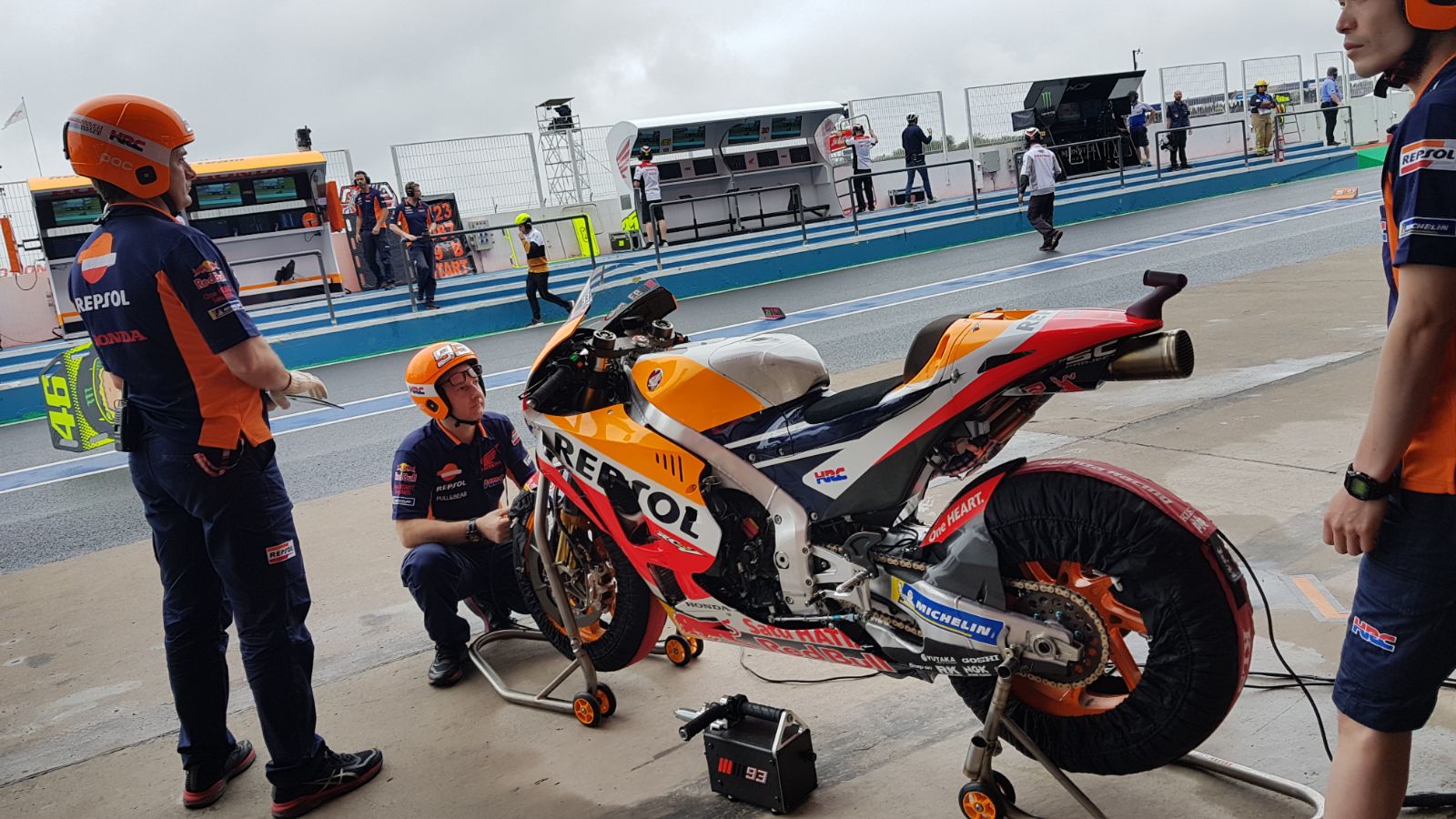 Realizar los cambios necesarios para adaptar la moto a la lluvia o a seco, es un proceso que para los mecánicos del Equipo Repsol Honda requiere tan solo de entre 3 y 5 minutos. Los técnicos trabajan de forma simultánea en varias partes para ahorrar tiempo, y es que el clima puede darnos sorpresas inesperadas.