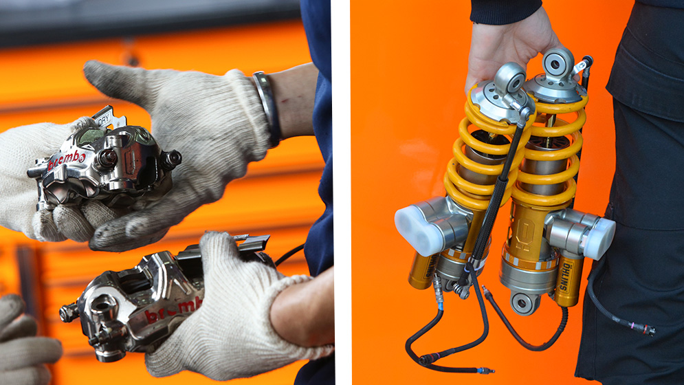El primer elemento a tener en cuenta son naturalmente los neumáticos. En condiciones normales las MotoGP montan slicks, pero cuando llueve estos se cambian por neumáticos de lluvia que ofrece un mayor agarre en mojado. Aprovechando que la llanta está fuera de la moto, se puede proceder también al cambio de discos de freno si el equipo lo considera necesario. En lluvia era habitual montar frenos de acero en lugar de los de carbono, aunque desde hace un tiempo se usan más estos últimos en todas las condiciones, eso sí, instalando las coberturas que nos permitan mantener la temperatura del disco en un rango aceptable. Lo que sí que se cambia necesariamente son las pastillas de freno, instalando unas más adecuadas para condiciones húmedas.