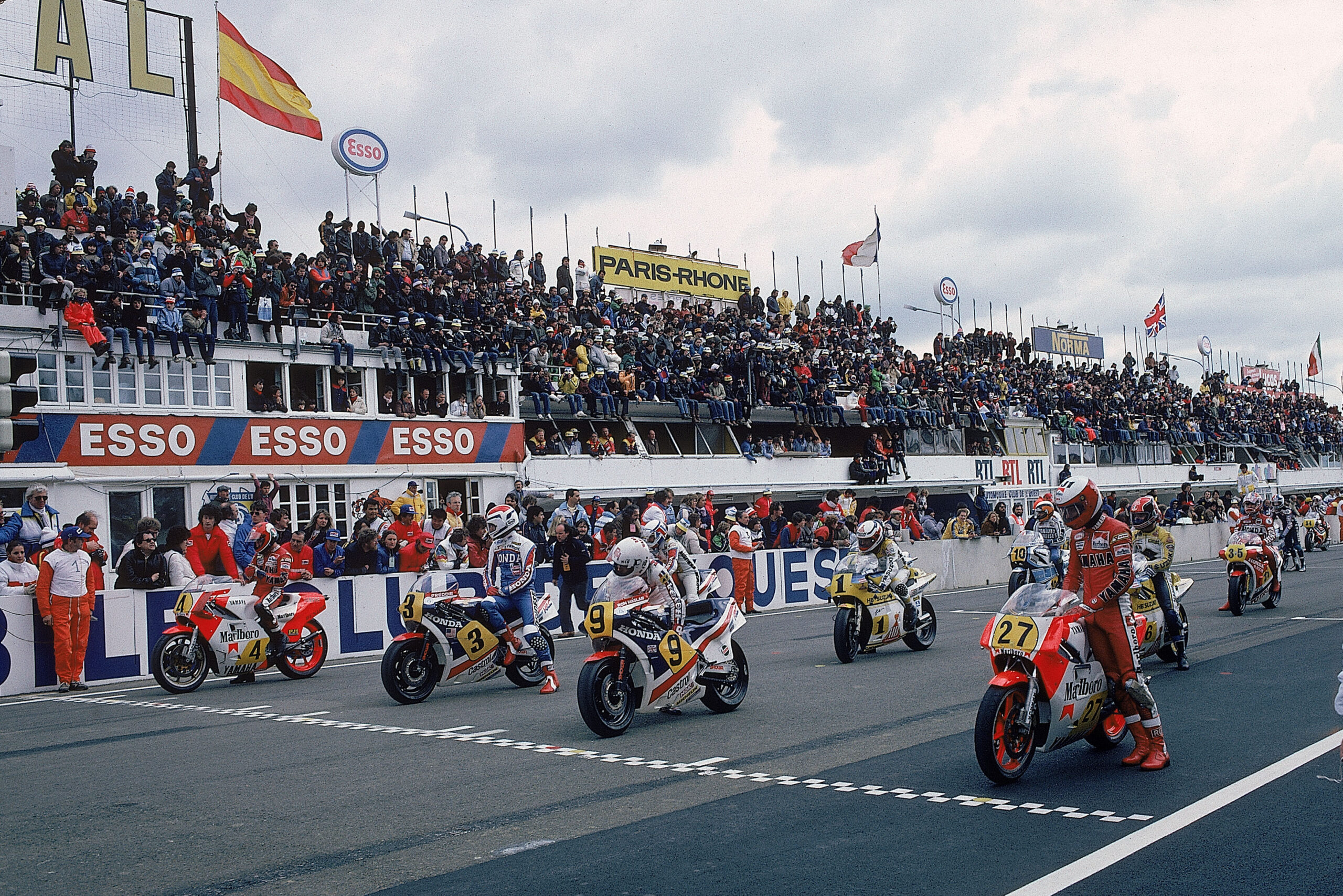 Poner en marcha un motor de dos tiempos no era una tarea complicada. Bastaba con engranar segunda velocidad, coger el embrague y empujar, y en el momento en que se alcanzaba cierta inercia, un movimiento coordinado de acelerador y embrague –soltando el embrague y dando gas– permitía que el motor cobrara vida. A veces un exceso de gas engrasaba las bujías y ahogaba el motor, haciendo imposible su puesta en marcha. En una ocasión, en Assen 1982, Kenny Roberts y Barry Sheene se quedaron fuera de la carrera en la salida porque sus motores V4 se negaron a arrancar. Otras veces el motor arrancaba con facilidad, pero era un suplicio conseguir llevarlo al régimen óptimo de funcionamiento.