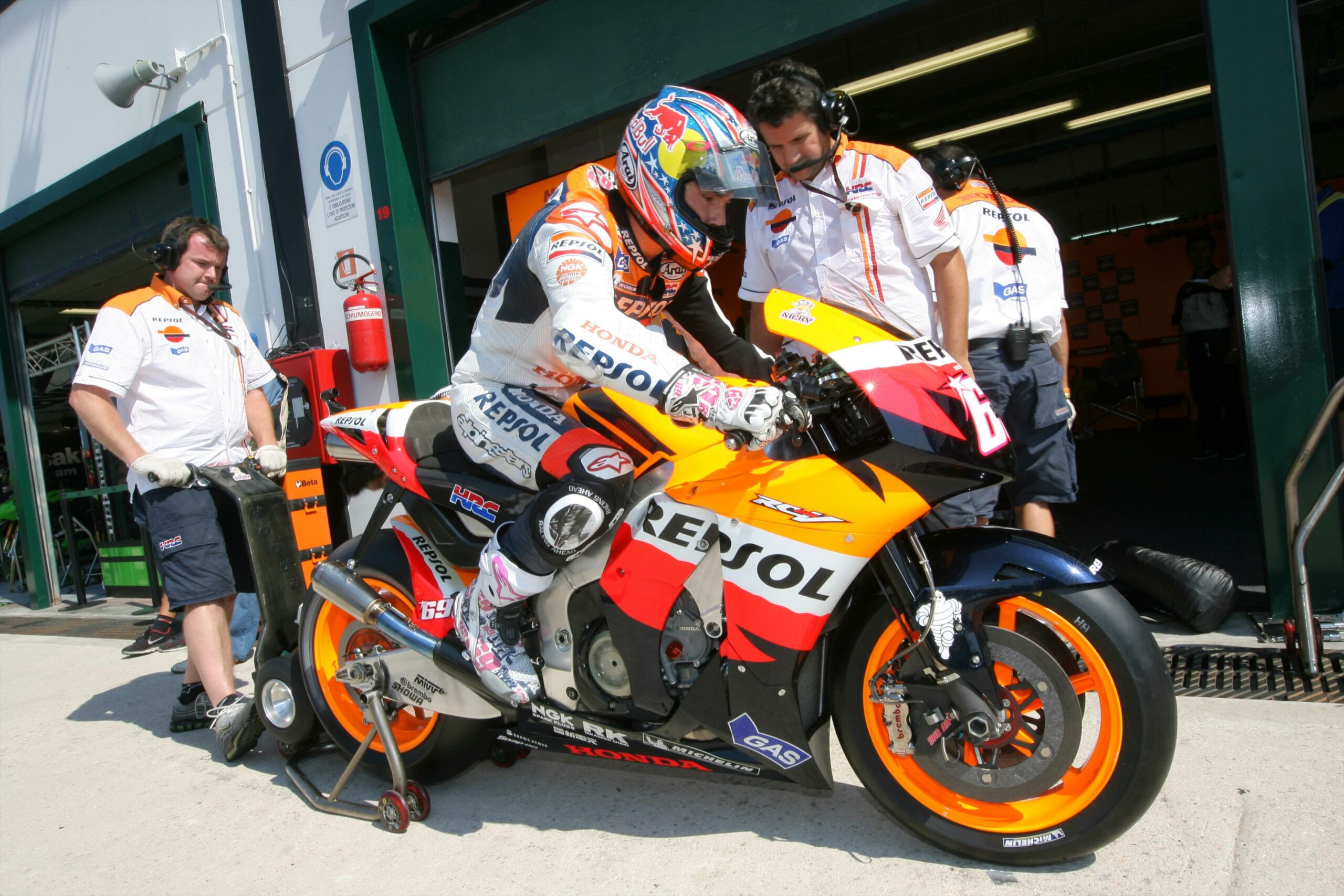 Estábamos acostumbrados a la típica escena de los mecánicos empujando una moto para ponerla en marcha. Con las pequeñas motos de 125 c. c. , los más hábiles conseguían incluso arrancarla con una mano: se subía la moto a un caballete, con el piloto encima para manejar embrague y acelerador, mientras que el mecánico, con un ágil y enérgico movimiento, hacía girar la rueda trasera. Y el motor cobraba vida.
