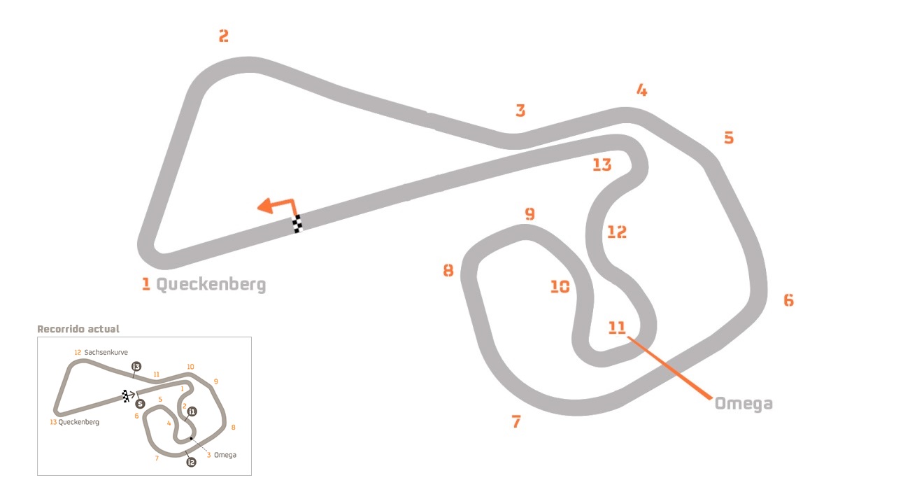 Este trazado alemán es bien conocido por ser el circuito que menos curvas a derechas tiene, lo que significa que en el trazado actual el flanco derecho del neumático pierde agarre en la curva 11 (curva 3 en la imagen). Si invertimos la situación, el neumático no sería tan problemático como el hecho de que la curva mencionada sea cuesta arriba con salida ciega, lo cual haría que la moto tuviese tendencia a despegar. Al llegar a toda velocidad, tomar esta trazada que no puedes ver, sería un salto de fe, en ocasiones literal.