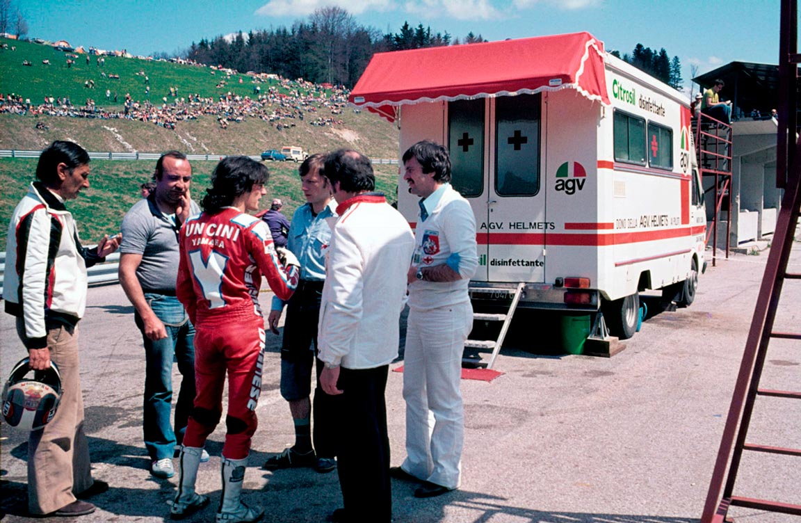 El debut de la clínica móvil, en el Gran Premio de Austria de 1977, resultó ser más que oportuno, ya que tras un accidente grave su intervención servía para salvar la vida de Franco Uncini, piloto de 350cc, en el circuito de Salzburgring (Austria).