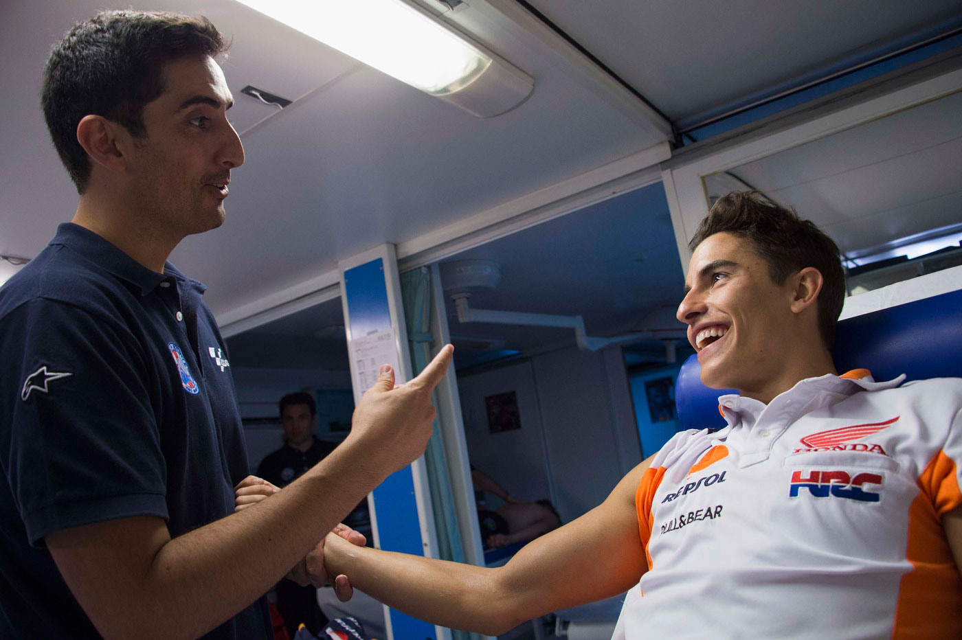 Marc Márquez con el único fisioterapeuta español de la clínica móvil, Carlos García, en el GP de Gran Bretaña de 2017. Foto: Mirco Lazzari