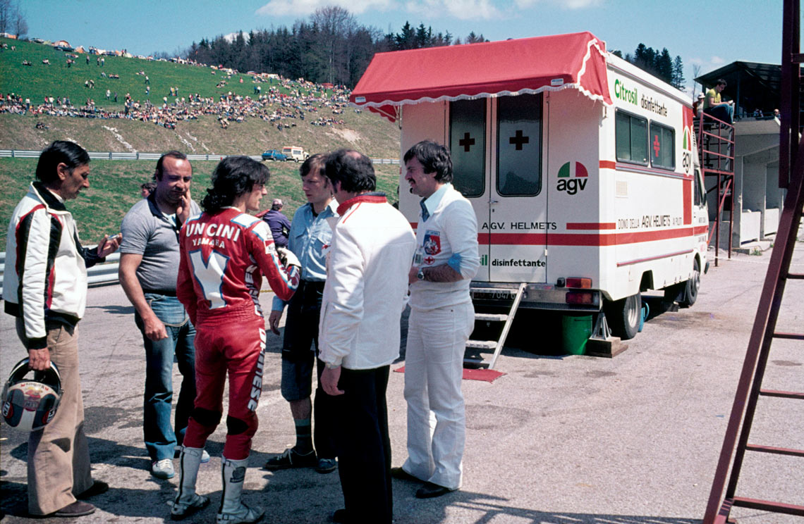El piloto italiano Franco Uncini sufrió un accidente cuando corría en la categoría de 350cc en el GP de Austria de 1977. Gracias a la intervención en la clínica móvil salvó la vida, en el mismo GP en el que aparecía por primera vez.