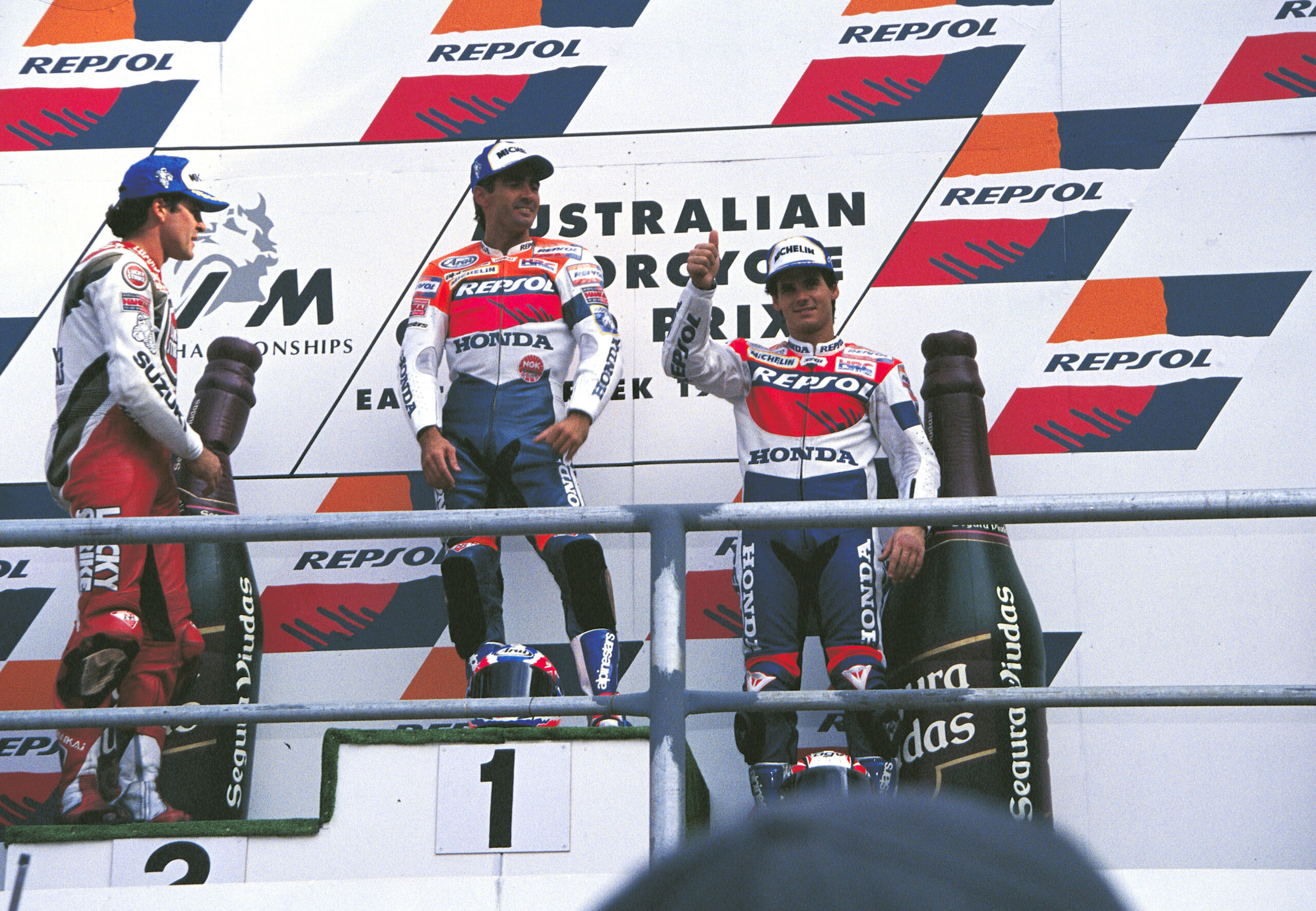 La primera carrera del año y el debut del equipo Repsol Honda fue un triunfo épico. No hay mejor forma de consolidarse en la competición que consiguiendo la victoria, la vuelta rápida y la pole. El autor de tal hazaña fue el pentacampeón del Mundo Mick Doohan, quien cruzó la meta a 13,4 segundos del segundo clasificado, firmando así un aplastante dominio en su Australia natal.