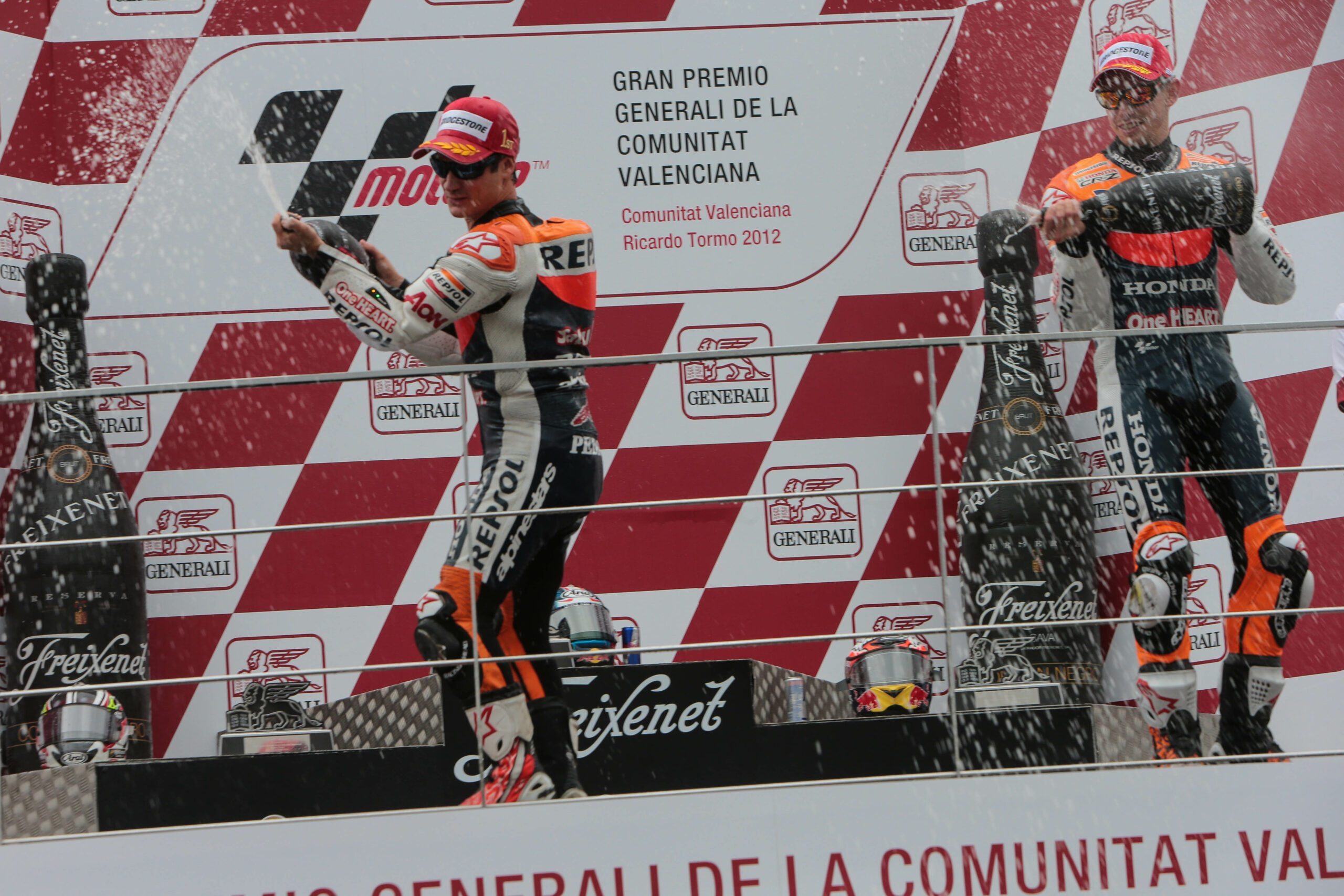 Dani Pedrosa ha sido ocho veces ganador del GP de Valencia, pero ninguna tan vibrante como en 2012. Una intensa lluvia anterior había cubierto la pista, pero el asfalto comenzaba ya a secarse. En estas circunstancias, el piloto del Repsol Honda decidió durante la vuelta de calentamiento, entrar a cambiar su moto por la de seco, así que a pesar de haber conseguido la pole, salió en la peor posición posible en aquella carrera: el pit Lane. Pedrosa fue recuperando posiciones hasta hacerse con una victoria espectacular, sacando una ventaja de 37,6 segundos a Nakasuga, que quedaba en segunda posición. El podio quedó completado por otro piloto Repsol Honda; Casey Stoner, para quien era el último GP de su carrera deportiva.