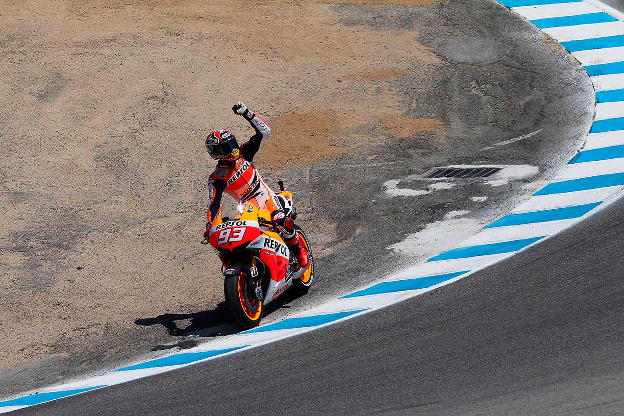 Durante las primeras vueltas Rossi retenía el segundo puesto. En el cuarto giro, justamente en el “sacacorchos”, Marc adelantaba al de Tavulia en una maniobra, hasta entonces única en la historia de MotoGP. El sector de dos curvas muy seguidas con un marcado desnivel en descenso solo había visto un único adelantamiento hasta la fecha. El autor de aquel primer adelantamiento había sido el mismísimo Rossi, que ahora veía las tornas giradas contra él a manos de un piloto fuera de serie.