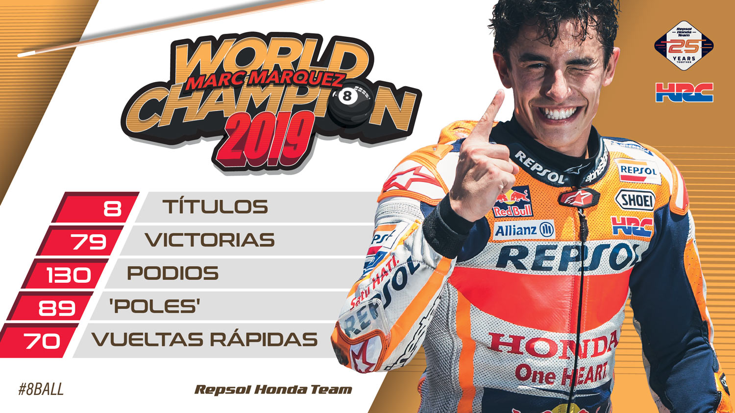 Márquez llegó al Mundial en 2008 y deslumbró a todos subiendo al podio en la que tan sólo era su sexta carrera en el campeonato, luciendo ya los colores de Repsol en su mono. Explotó en 2010 adjudicándose el primer título de su palmarés en 125 c. c. y, tras un brillante paso por la categoría de Moto2 durante dos temporadas en la que también logró un título, su llegada al equipo Repsol Honda le ha confirmado como uno de los mayores talentos no solo de la historia del motociclismo, sino como figura del deporte mundial.