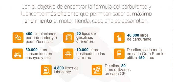 A pesar de lo que se pueda especular, las motos del Mundial de Motoclismo, incluídas las del Equipo Repsol Honda que pilotan Marc Márquez y Pol Espargaró, no usan carburantes con un mayor índice de octanos, ni nada parecido a un combustible de aviación —o para cohetes—, que les proporcione una potencia extra.