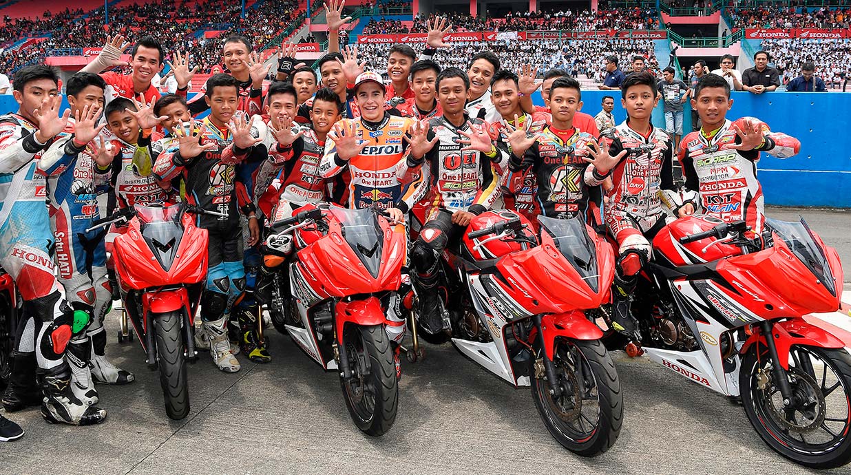 En reconocimiento a esta pasión, nuestro equipo ha realizado la presentación en la capital del país, Yakarta, desde 2015 hasta el 2018. Pero aquí no acaba la cosa. En 2016, con el título recién ganado en la milagrosa carrera del GP de Japón, Marc Márquez estuvo en un encuentro con 15 prometedores pilotos de la escuela Astra Honda Racing School con quienes realizó varias vueltas al histórico circuito de Sentul. En las fotos podemos ver al Campeón del Mundo arropado por una multitud de jóvenes pilotos, sonrientes al estar junto a su ídolo. Todos ellos levantan la palma para celebrar el quinto Mundial del 93 con un sonoro ¡Give me 5!
