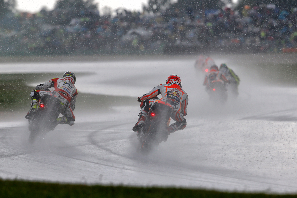 Aunque la lluvia puede aparecer en cualquier circuito, hay algunos en los que suele hacerlo con más probabilidad. Estamos hablando de lugares como Silverstone o Motegi, en los cuales el tiempo puede dar un giro brusco y pasar del sol a la lluvia en cuestión de minutos. Una carrera en lluvia presenta muchas exigencias específicas que afectan al pilotaje y a los ajustes de la moto.