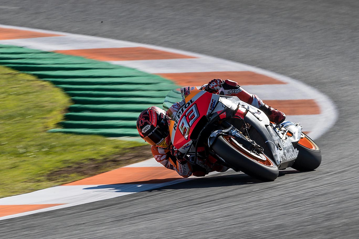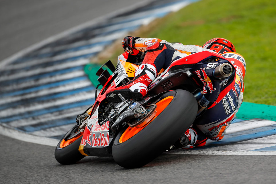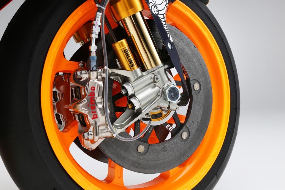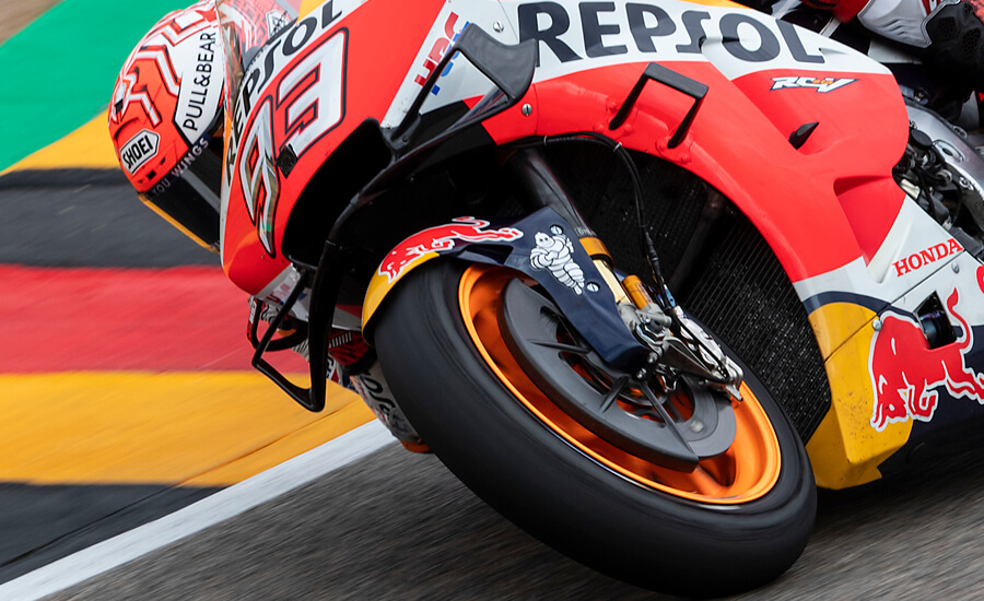 Hablamos de un punto de contacto equivalente a poco más que la de una moneda de 2€. A través de esta pequeña zona, el piloto va a desatar toda la caballería de motor y frenos de una de las motos más avanzadas del planeta. Mientras soporta estas fuerzas, el neumático debe mantener en todo momento su forma, sin sufrir deformaciones.