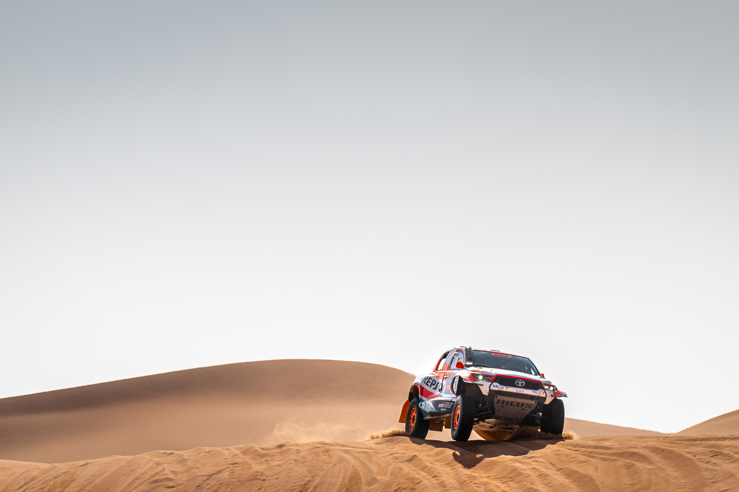 La décima etapa ha sido redonda para el equipo que apoyan Repsol, MGS Seguros, KH-7 y Toyota España, que ha salvado con tranquilidad multitud de pequeños peligros, como relata el copiloto Txema Villalobos: “No es que hubiera muchos tramos de gran dificultad, sino pequeños momentos bastante complejos. Por ejemplo, las dunas cortadas en el inicio, o las de nivel 3 que nos hemos encontrado en la parte final, incluyendo una subida especialmente difícil. Con todo, el coche ha demostrado en todos estos puntos todas sus virtudes. Más allá de estos aspectos, hemos sorteado bien las trampas de navegación y hemos conseguido rodar al ritmo que queríamos”.
