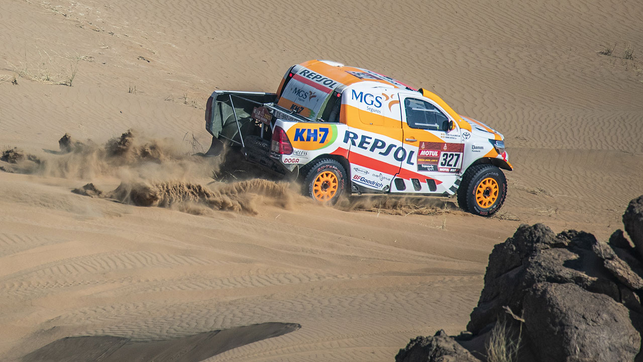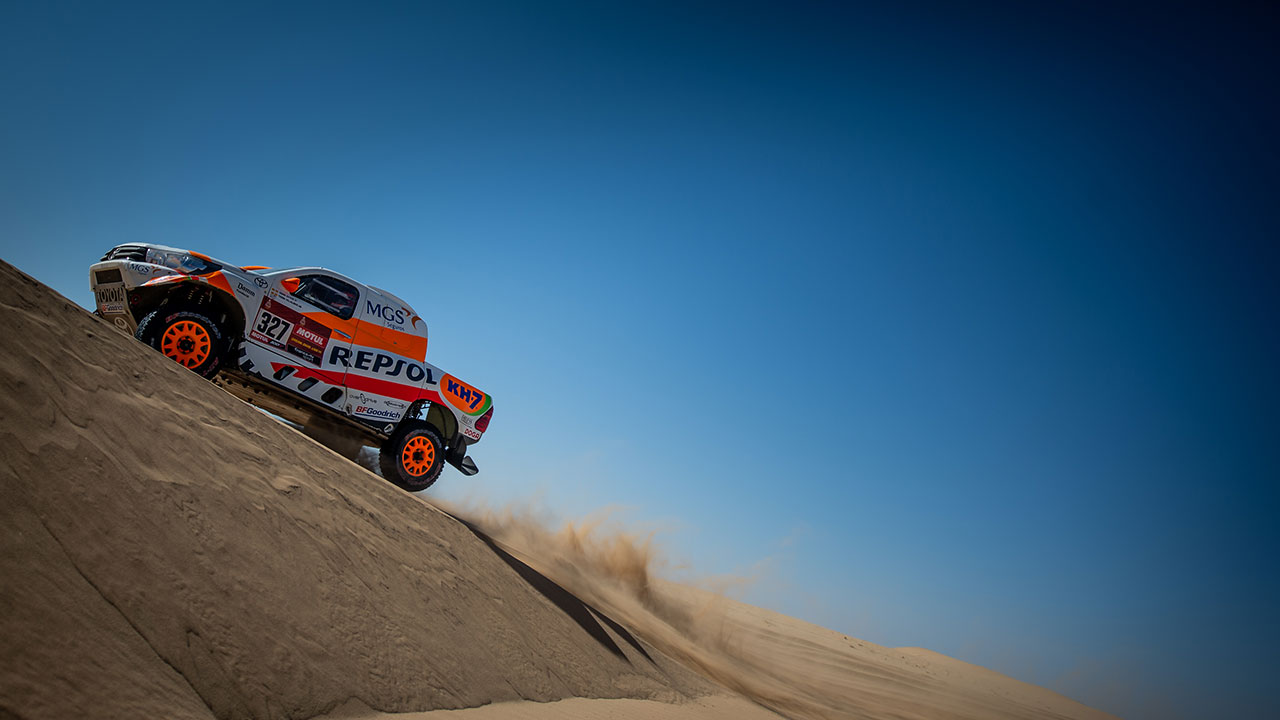 “Hemos sufrido mucho, aunque por fin pudimos comprobar lo bien que se comporta el Toyota Hilux en las dunas, incluso en las de máxima dificultad. En la segunda parte de la jornada pudimos correr más, porque el recorrido era más rápido y así lo permitía. Lo importante es que no hemos tenido ningún problema mecánico, ni hemos cometido ningún fallo de navegación. Ahora toca descansar y reponer fuerzas porque quedan muchos días por delante para recuperar terreno”, apunta el piloto de Repsol, MGS Seguros, KH-7 y Toyota España.