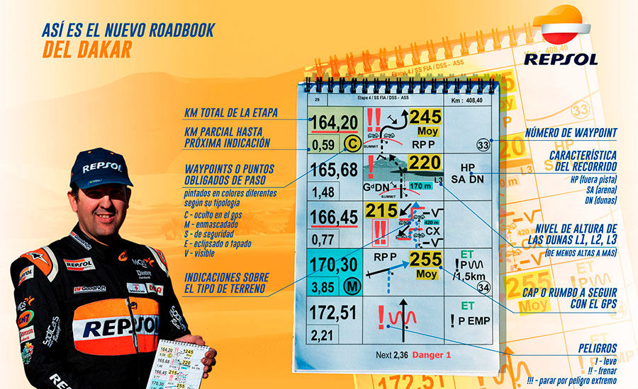 El roadbook o libro de ruta es un documento clave en la modalidad del rally raid, ya que detalla el recorrido de cada etapa con los diferentes puntos kilométricos, indica el rumbo a seguir en todo momento, informa de los obligados Waypoints o controles de paso y avisa de los posibles peligros que se encontrarán durante la ruta, como desniveles, estado de la pista, paso por ríos o altura de las dunas. Una información de vital importancia que los copilotos transmiten a sus pilotos sobre la marcha y de cuya interpretación depende en multitud de ocasiones el éxito o fracaso final.