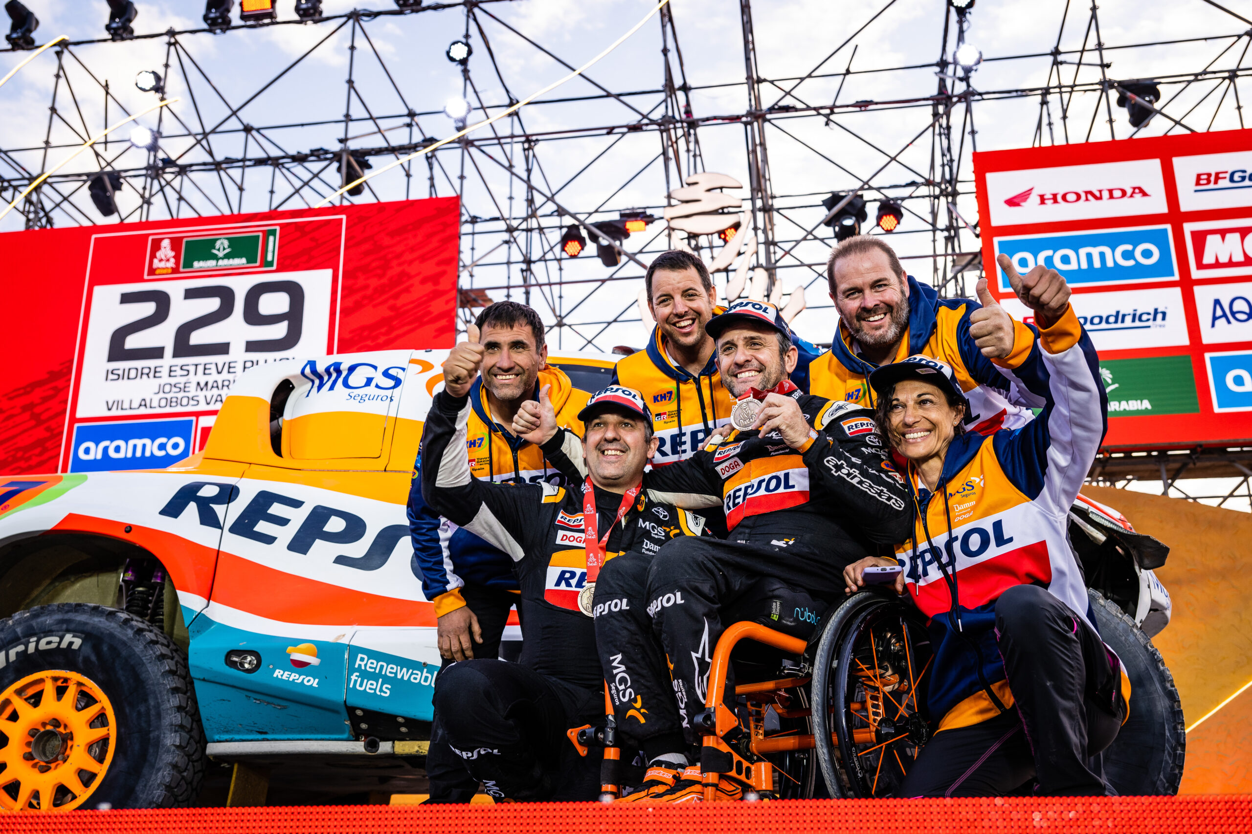 Misión cumplida. Isidre Esteve y Txema Villalobos han completado el Dakar 2023, una de las ediciones más difíciles de toda la historia y en la que, por primera vez, han podido pelear con las mismas herramientas que los principales favoritos, sin que su discapacidad suponga un escollo. Los del Repsol Toyota Rally Team han llegado al podio final situado en la localidad de Dammam (Arabia Saudí), tras completar los últimos 138 kilómetros cronometrados en 23ª plaza absoluta del día, 20ª en T1, y convencidos de que el top 20 en la clasificación final habría sido factible de no ser por un problemas técnico en el primer segmento de la etapa maratón.