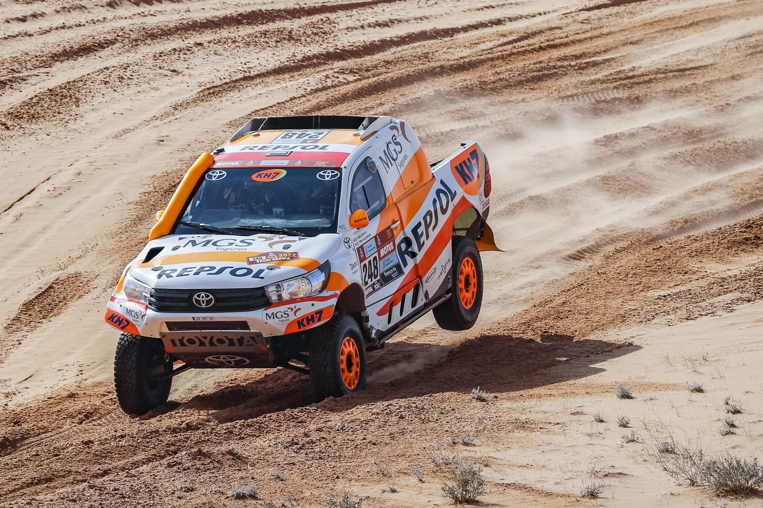 Los españoles han vivido un momento de máxima tensión hacia el final de la etapa, en un cordón de dunas. Allí, se han encontrado con otros participantes y en un momento dado, mientras bajaban una duna cortada, se han topado con un coche completamente parado. El de Oliana ha tirado de velocidad de reacción para evitar embestirle y solo ha dañado la aleta delantera derecha.