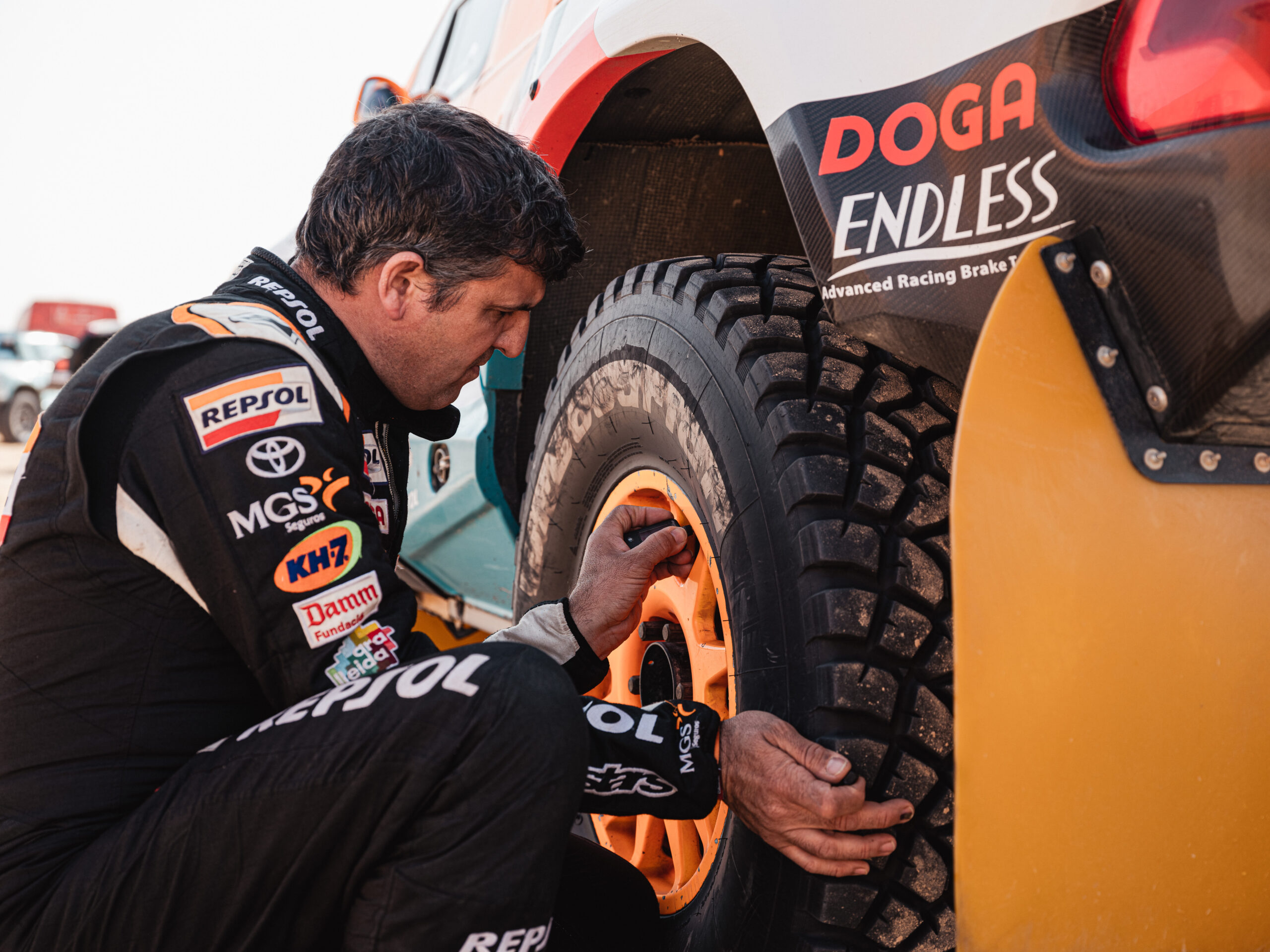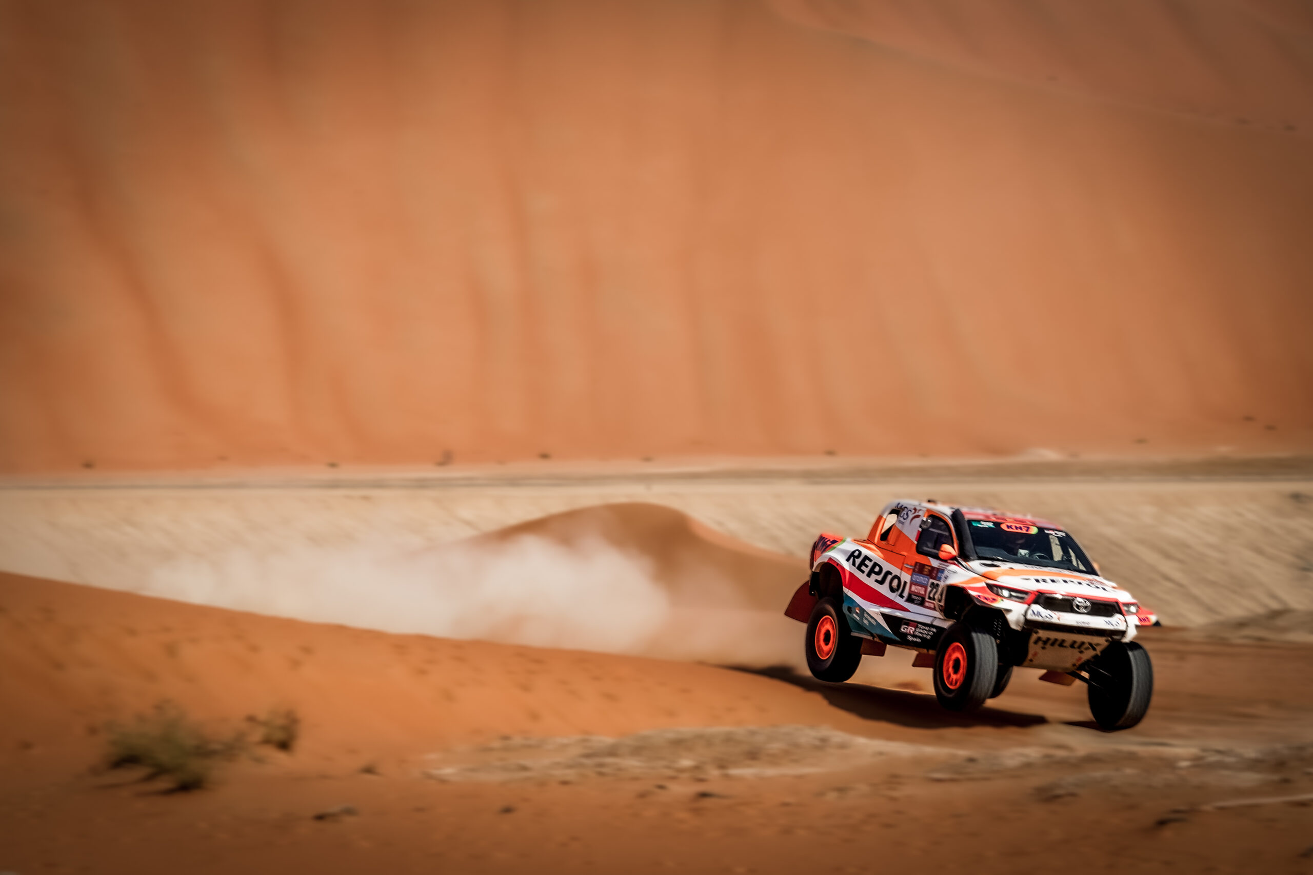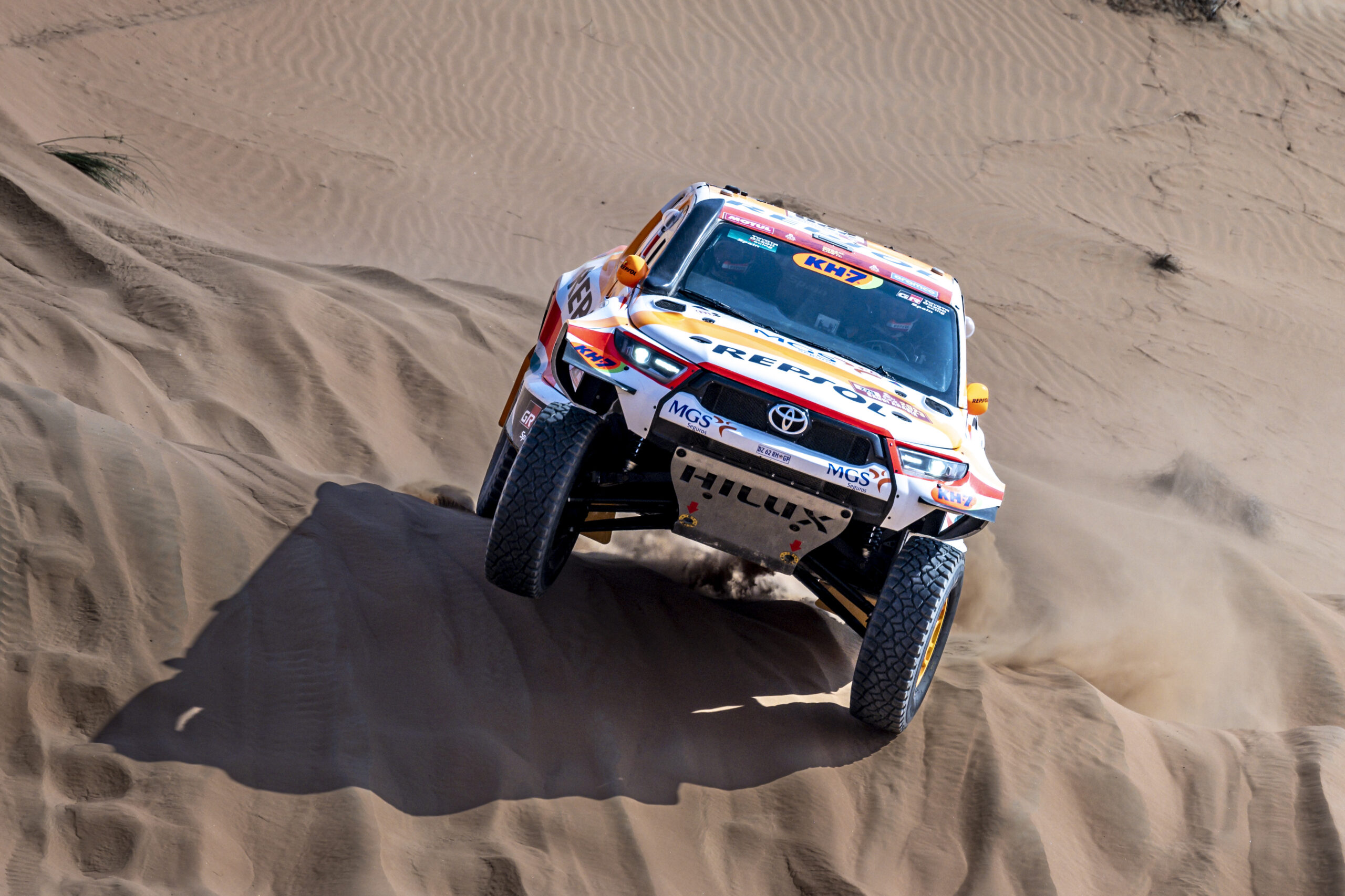 El primer segmento de etapa maratón vaticinaba grandes dificultades, tanto en la navegación como por la propia naturaleza del recorrido, que alternaba zonas rápidas con tramos de arena y dunas. Isidre Esteve y Txema Villalobos sorteaban la primera mitad de la especial rodando a muy buen ritmo y recuperando terreno respecto a la jornada de ayer, que cedió un gran protagonismo a los buggies ligeros (T3 y T4). Sin embargo, en el kilómetro 180 ha llegado el primer desafío, como relata el piloto ilerdense: «Hemos saltado una duna sin mayor problema, pero al aterrizar he calado el coche. Cuando lo he intentado volver a poner en marcha, el motor de arranque no funcionaba. Por suerte estábamos en bajada, así que, cuando Txema ha quitado arena de las ruedas, ha bastado un empujón para hacer revivir la mecánica y seguir adelante”. Primera dificultad salvada, pero a cambio de un hándicap notable: la tripulación española no podía volver a calar el Toyota, y todavía les quedaba un largo tramo de arena por salvar…