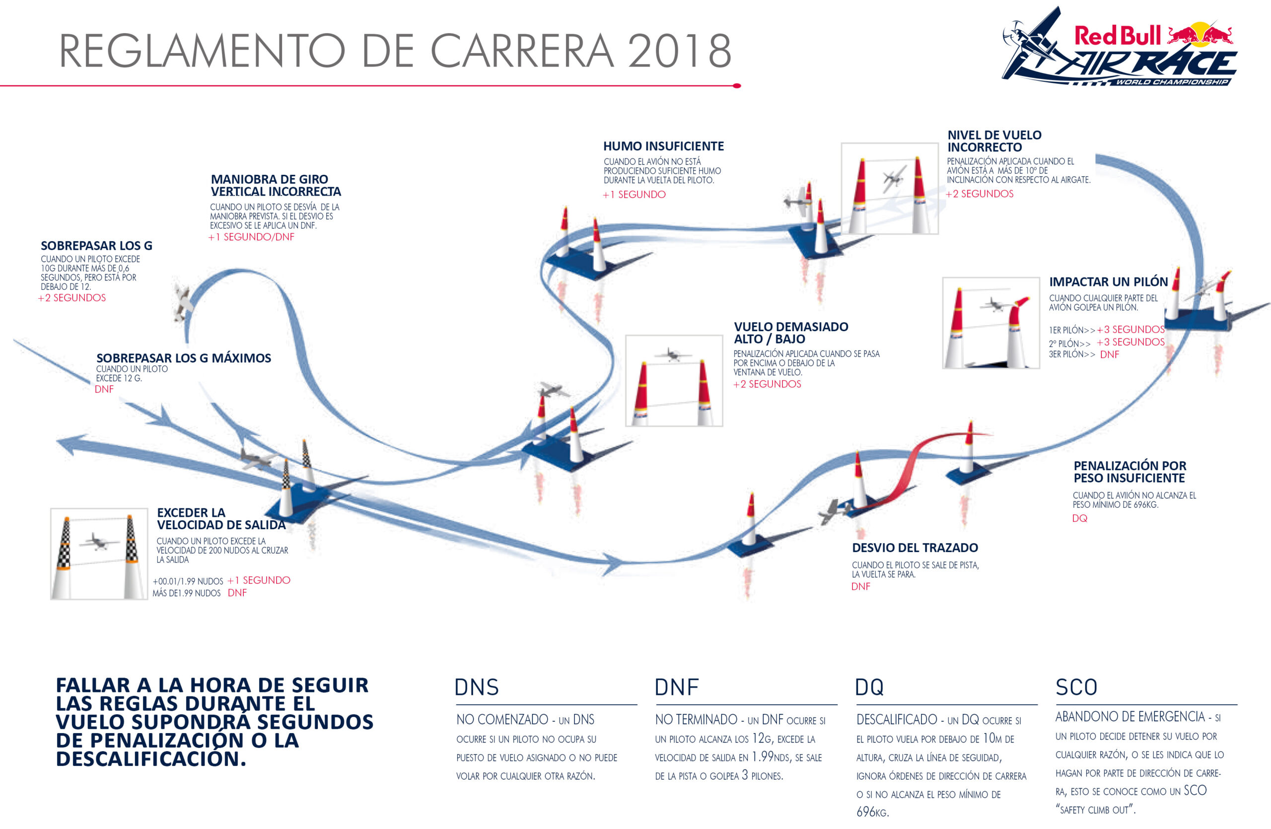 No obstante, determinadas infracciones pueden llevar a un DNF (no finaliza la carrera) o a la descalificación. Durante la carrera todo sucede muy rápido. Para completar el circuito, se necesita un minuto aproximadamente y el avión pasa por un pilón o puerta cada cuatro o cinco segundos. Por tanto, estas decisiones se deben toman en un abrir y cerrar de ojos.
