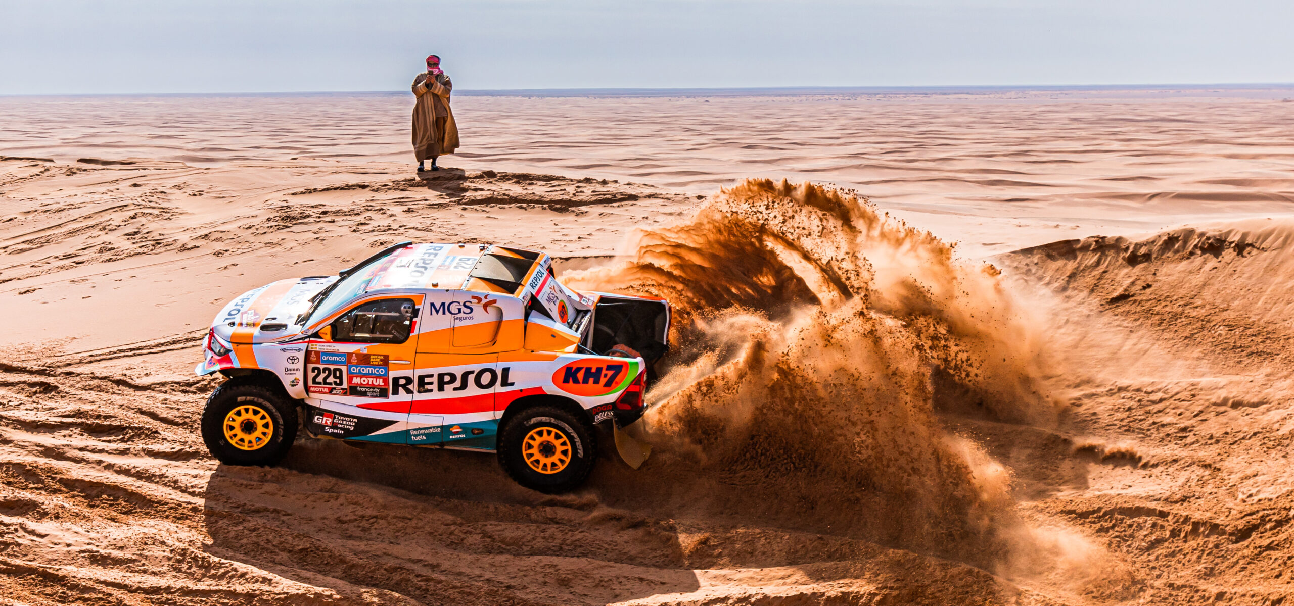 Los integrantes del Repsol Rally Team han perdido más de media hora entre un enganchón en las dunas y problemas en los amortiguadores.
