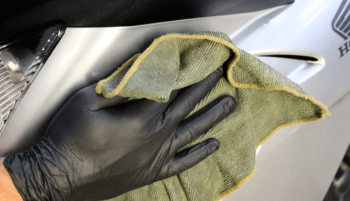 Aunque no hay inconveniente en utilizar agua fría, si es posible es mejor que esté tibia, ya que aumenta su efectividad en la retirada de la suciedad. Con una esponja suave o guante/ trapo de microfibra, lo sumergimos en el cubo de agua con jabón y empapar la zona de la moto que vayas a limpiar sin ejercer presión. También es recomendable utilizar un pulverizador con la mezcla de agua jabonosa, de esta manera cuando una superficie está muy sucia no arrastraremos las partículas de suciedad y no rayaremos la pintura. Es importante empezar por las partes superiores e ir bajando. Una vez retirada la suciedad, aclaramos con agua directa de una manguera o vertemos desde un cubo con cuidado. Esto retirará las partículas para posteriormente secar con otro trapo de microfibra sin riesgo a deteriorar la superficie.