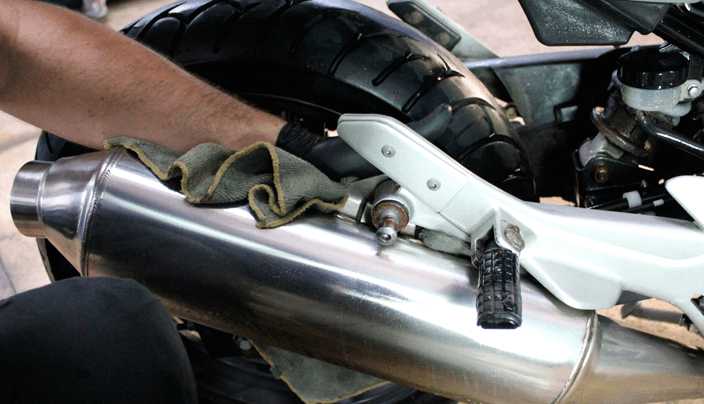 Con el agua debes tener cuidado. Es muy importante tapar el tubo de escape cuando vayas a lavar una moto. El agua tarde o temprano puede entrar en el interior del tubo de escape y provocar una ligera corrosión que se agrave con el tiempo. Con una pequeña bolsa y algo de cinta o un paño seco puedes tapar el agujero del tubo de escape y evitar una posible avería.