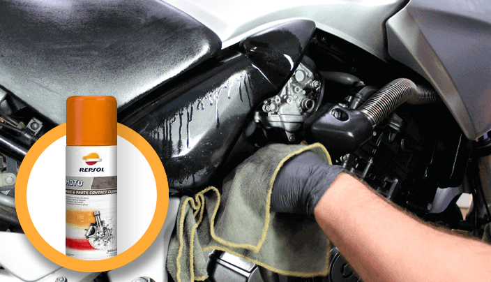 El uso de desengrasante, siempre diluido en agua, es aconsejable, pero solo para las partes sin cromar o de metal, basculante, escapes, etc. Además, estas suelen ser las más afectadas por la grasa. Al utilizar estos productos, nos aseguramos de que no entren en contacto con superficies delicadas.
