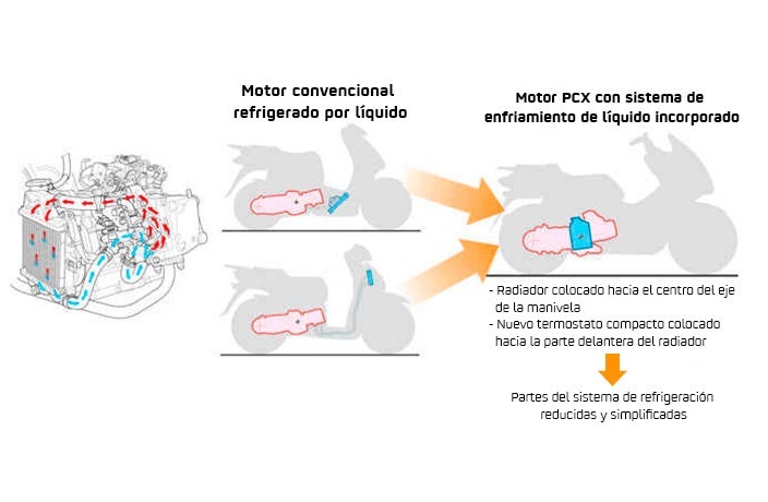 El citado líquido, una vez ha “enfriado” el motor, se dirige a un radiador donde se produce un intercambio calorífico al exponerse al aire forzado bien por la propia marcha de la moto, bien por un electro-ventilador.