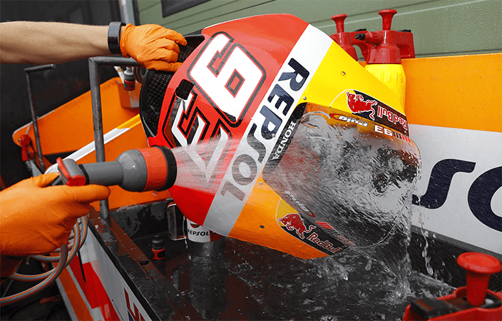 Aunque las llantas de fibra de carbono también se han generalizado, el camino no fue precisamente de rosas. Durante la prueba inaugural de 1984 en Sudáfrica Freddie Spencer hacía debutar la versión primigenia de la legendaria Honda NSR 500, una revolucionaria V4 de la marca japonesa que invertía las ubicaciones del depósito de combustible –bajo el motor- y los tubos de escapes –por encima del chasis- y contaba con otras sofisticadas soluciones como las llantas de fibra de carbono. Fue sólo el primero de una larga lista de problemas para una moto cuya desbordante potencia no conseguía transmitirse al asfalto. En el método de “prueba-error”, como en cualquier otro ámbito, suele estar la llave de la evolución de las motos de competición.
