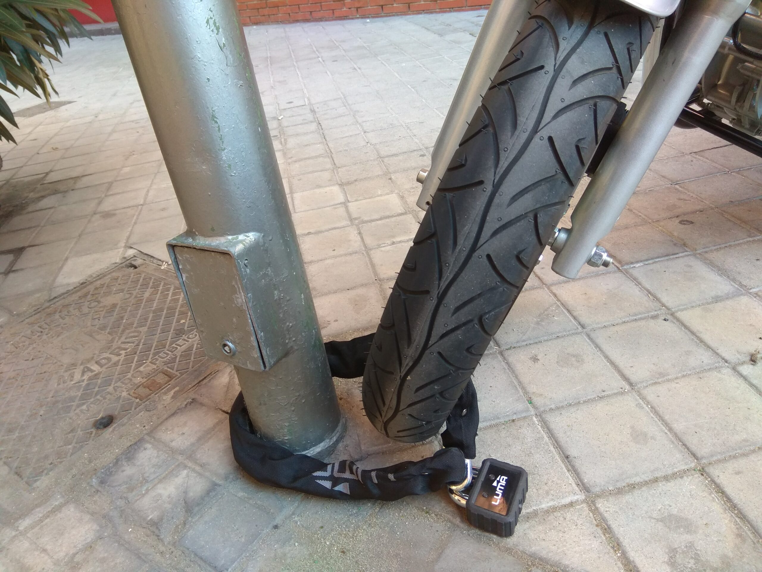 Tampoco está de más poner uno en cada rueda si la moto va a estar estacionada mucho tiempo en un lugar o si se deja en un mismo sitio con frecuencia. Y si ya la podemos anclar con una cadena o un candado de arco a algún elemento fijo lo suficientemente robusto, mucho mejor. Al respecto, hay que tener en cuenta que en algunas ocasiones te pueden multar por dejar la moto “atada” a ciertos elementos de la vía pública. En algunas zonas habilitadas para el aparcamiento de motos existen pequeñas vallas o “bolardos” específicos para este fin. También se pueden “atar” dos motos entre sí para que sea más difícil moverlas.