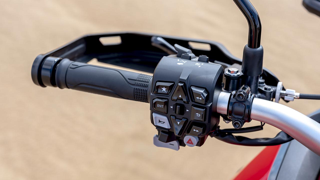 Gracias a todo esto, dispone de un sistema de control de par seleccionable, cuatro modos de potencia distintos para el propulsor, regulación en tres niveles del freno motor y otros tres de anti wheelie. Todos estos modos están coordinados mediante cuatro programas predeterminados: Tour, Urban, Gravel y Off-road, disponiendo además de dos programas adicionales totalmente personalizables por el usuario. Además, en el caso de montar la transmisión DCT, encontraremos también diferentes programas para control del sistema.