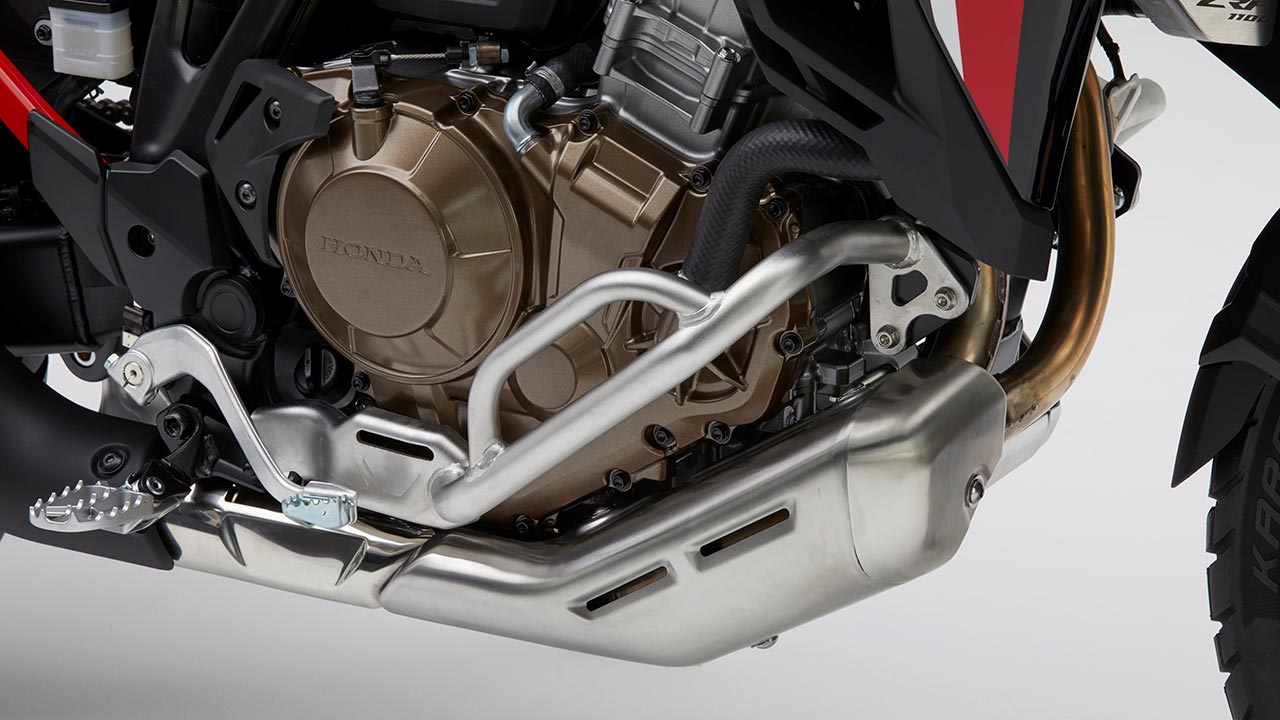 El motor de la CRF1100L cubica exactamente 1.084 cc entre sus dos cilindros en paralelo. Está refrigerado por líquido y tiene 8 válvulas accionadas mediante un solo árbol de levas. El cigüeñal calado a 270º, junto a un encendido irregular, le dan un sonido exclusivo, y permiten ganar tracción en la rueda trasera, igual que sucede con los motores Big Bang en MotoGP.