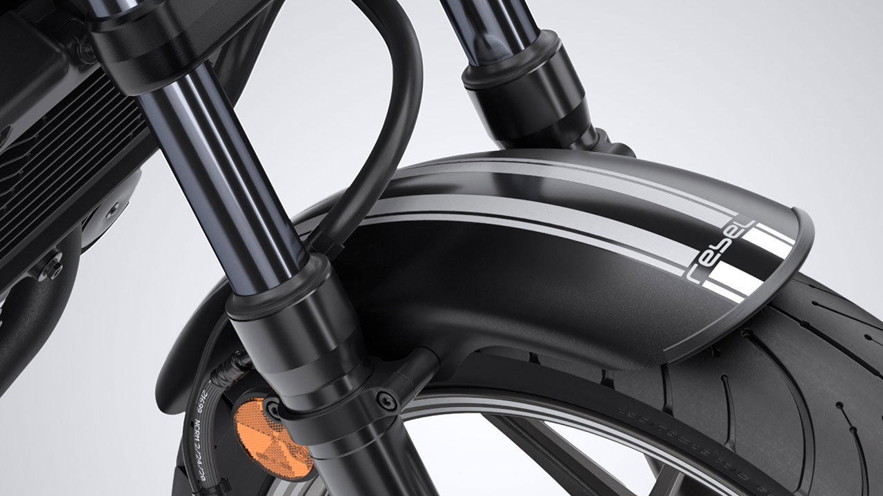 Dispone de una distancia entre ejes de 1520mm y una horquilla con un avance de 110mm y 30 grados de inclinación. Esto, unido a un peso contenido de 223kg, una altura del asiento de tan solo 700mm, la centralización de pesos y las suspensiones, una horquilla delantera con cartuchos de aluminio y barras de 43mm y un doble amortiguador trasero, otorgan a la Rebel 1100 un comportamiento dinámico ágil, a la vez que mantiene una estabilidad en línea recta perfecta para realizar kilómetros de autopista. Además, la geometría general permite también un buen ángulo de inclinación, que nos permitirá disfrutar también en carreteras de montaña.