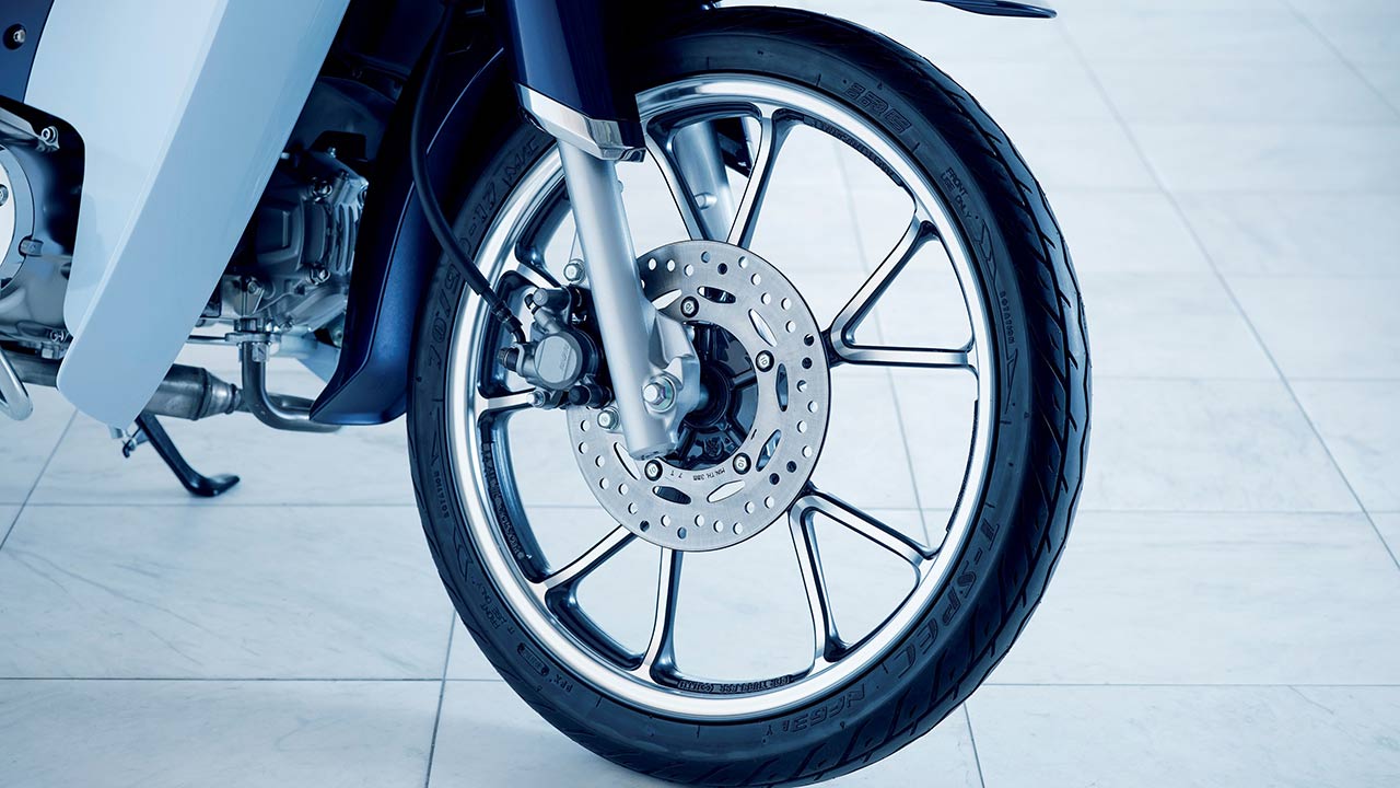 El bastidor de acero está optimizado para otorgar un equilibrio de rigidez y agilidad, algo en lo que siempre ha destacado la Super Cub. Las suspensiones delantera y trasera, las llantas de aluminio de 17 pulgadas y el freno de disco delantero ayudan también a un control ideal sobre esta peculiar moto.