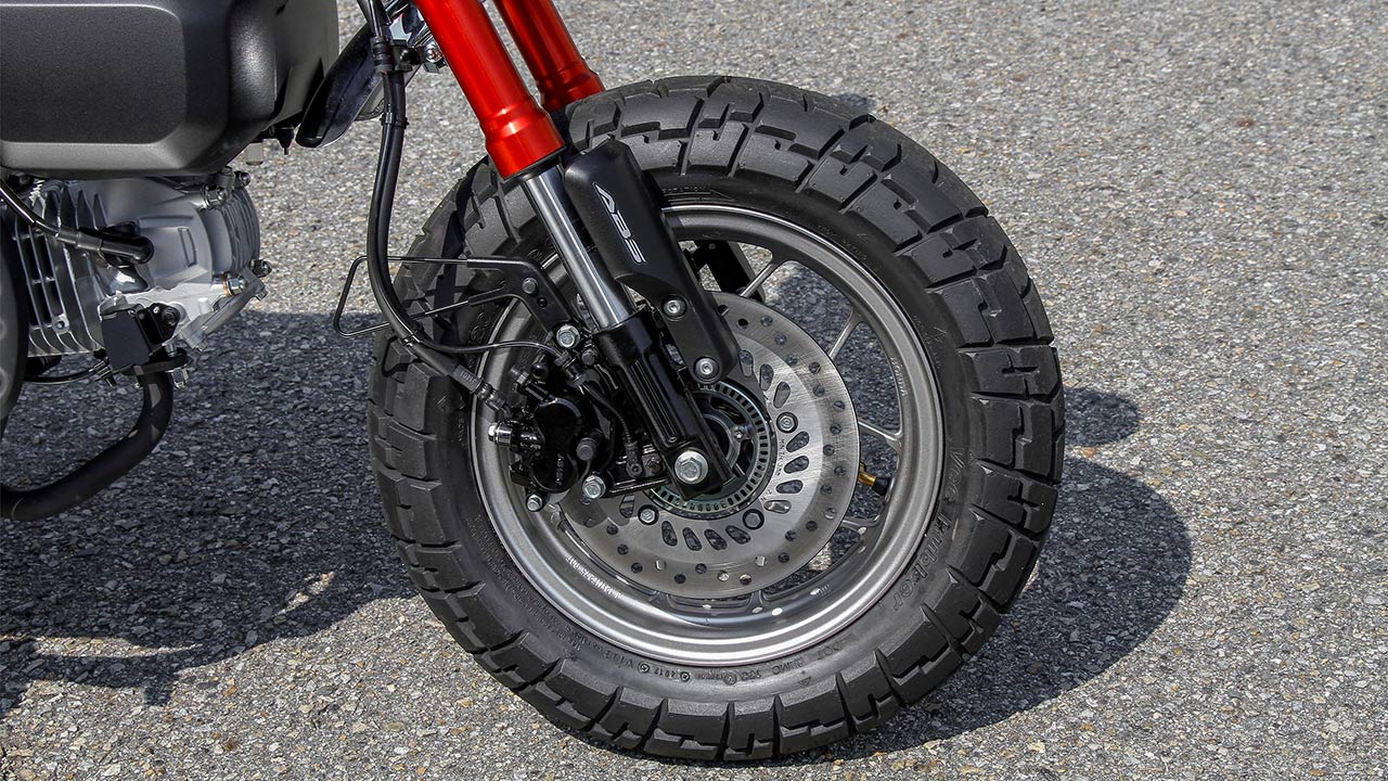 Al igual que en el caso de la Honda Grom, destaca una horquilla delantera invertida y, en este modelo, un doble amortiguador trasero. Monta ruedas de 12 pulgadas anchas con neumáticos mixtos y frenos de disco con ABS delantero controlado por una IMU.