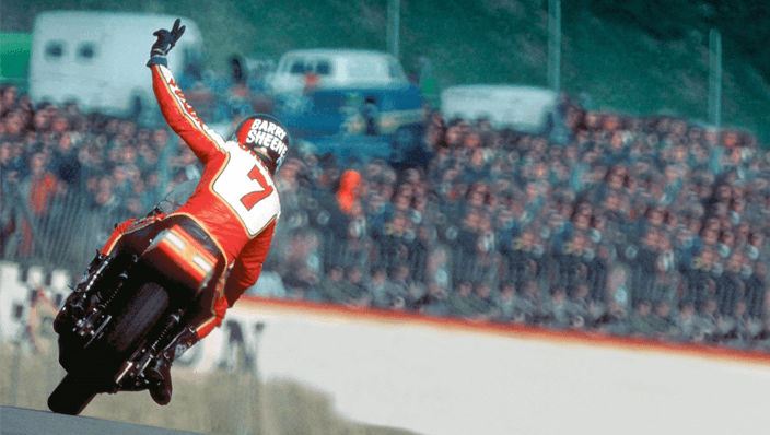 Volver la vista atrás nos lleva inevitablemente al gran Barry Sheene, aquel piloto inglés de la época de los setenta Campeón del Mundo de 500cc que fue el primer “piloto mediático” moderno.